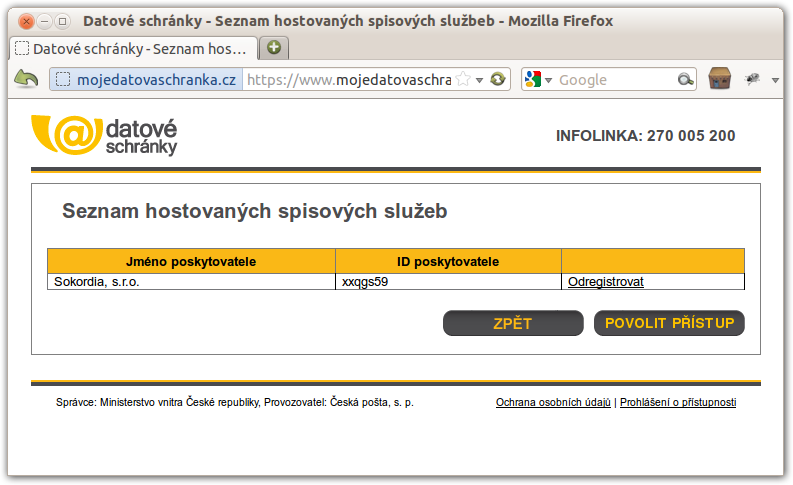 Po registraci je potřeba, abyste udělili souhlas společnostiSokordia, s.r.o. jako schválené tzv. hostované spisové službě přistupovat do Vaší datové schránky.